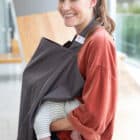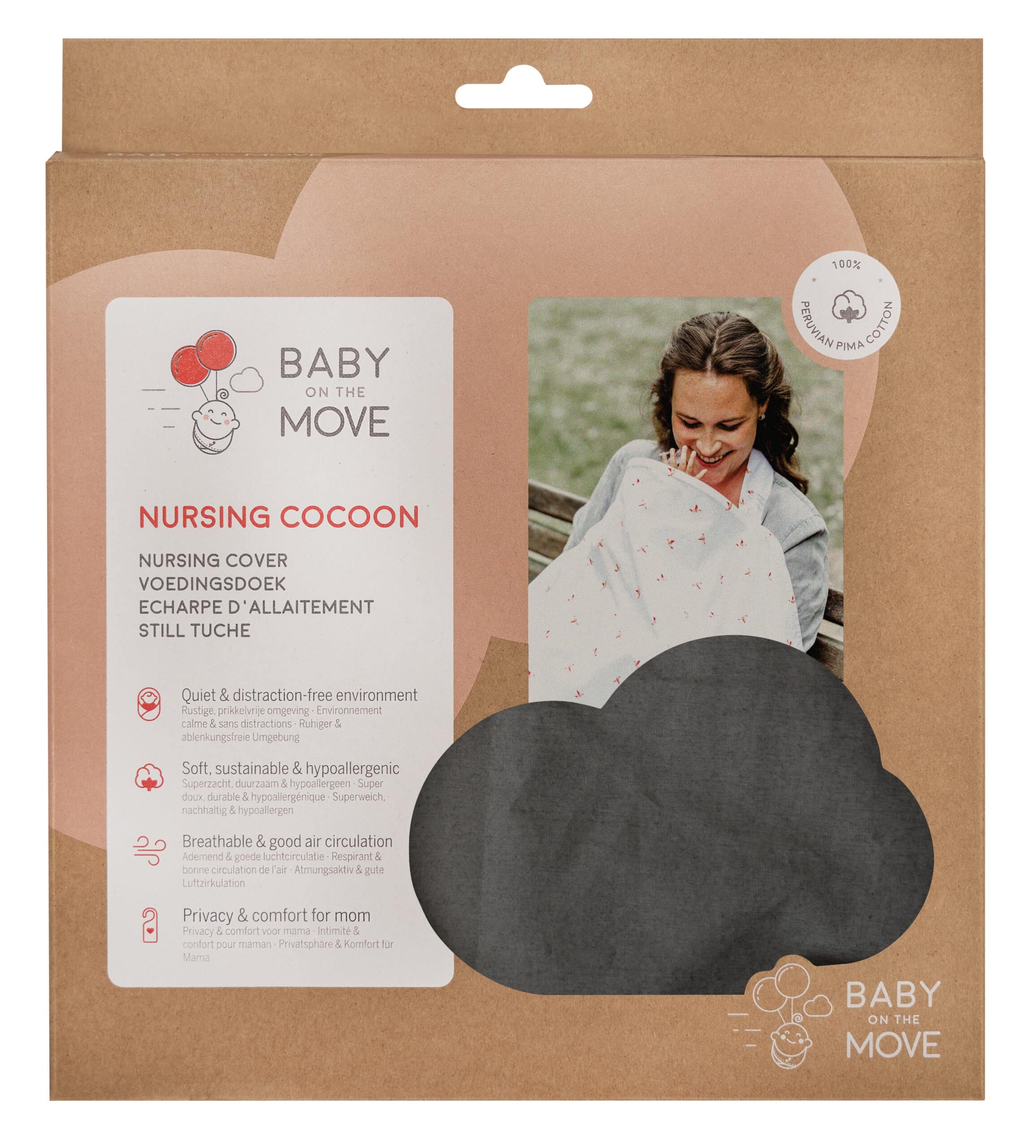 Our Baby on the Move premium Nursing Cocoon is made of 100% handpicked Peruvian Pima cotton. The original design with contoured neckline encourages you and your baby to continue breastfeeding comfortably while on the move.