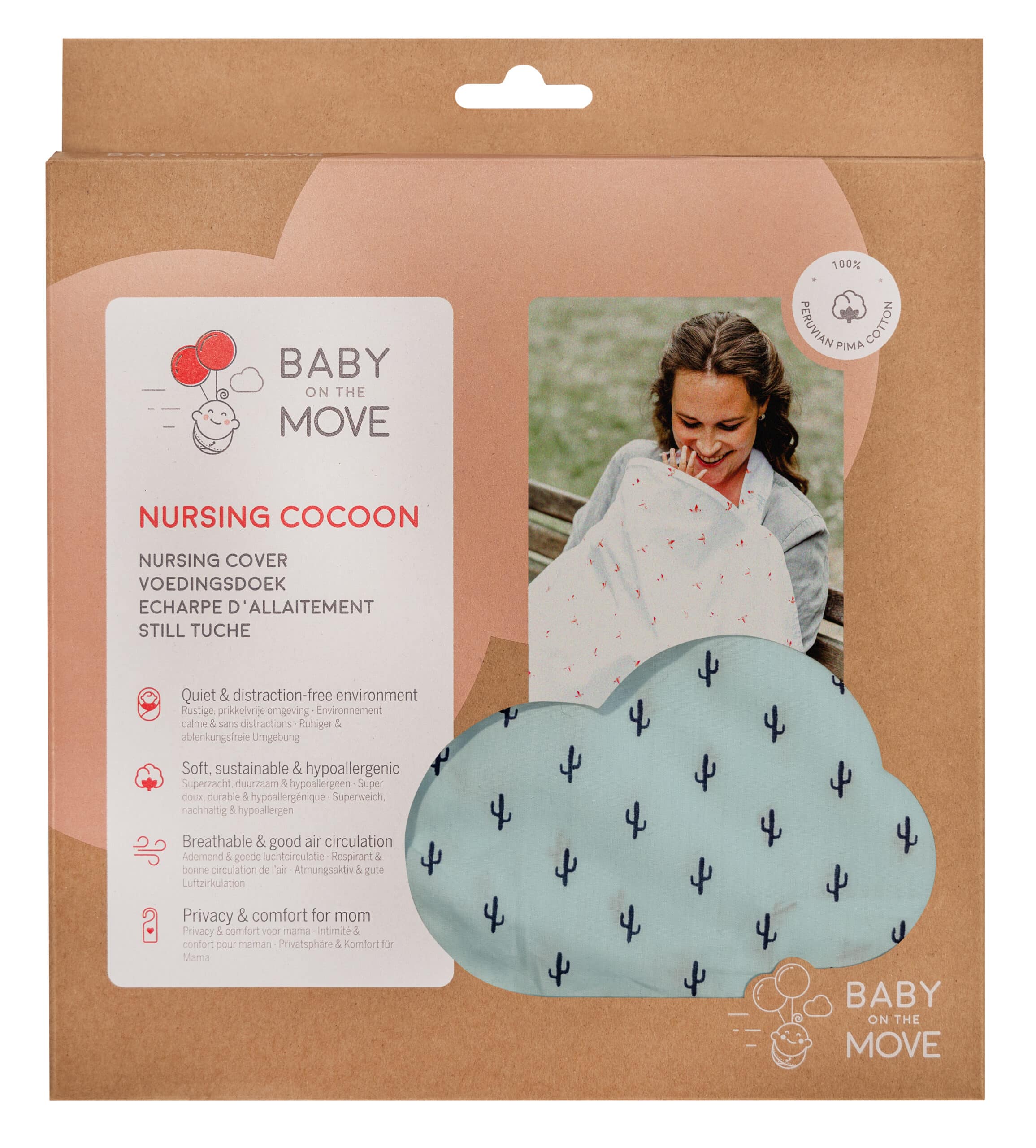The Breastfeeding Cocoon is made of 100% handpicked Peruvian Pima cotton wich contains exceptionally long cotton fibers. As a result, our cover feels luxuriously soft and it is also durable, breathable and hypoallergenic. Exactly the qualities we want for our little ones.