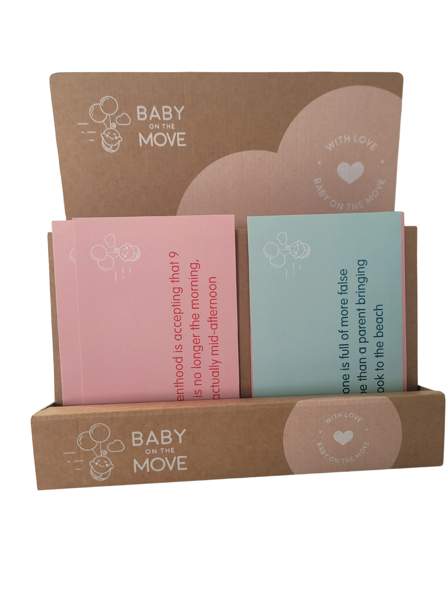 Our Baby on the Move postcards are perfect to include with any gift. They contain humorous quotes about parenthood and will make any parent smile. Plus, you can display them beautifully on your counter with the matching Postcard Display.