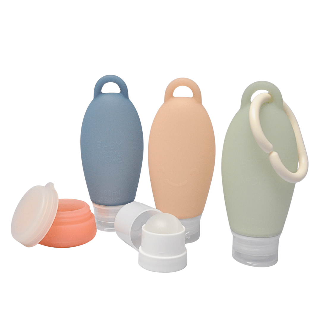 Our Travel Kit keeps your family essentials organized, leak-free, and always within reach! This compact set includes 3 color-coded bottles for everything from baby lotion to shampoo, plus a small jar that’s perfect for creams. The practical roller top makes applying sunscreen to wiggly little faces quick and tear-free. Use the handy ring to attach the bottles to your stroller or bag. Perfect for everyday needs or faraway adventures.